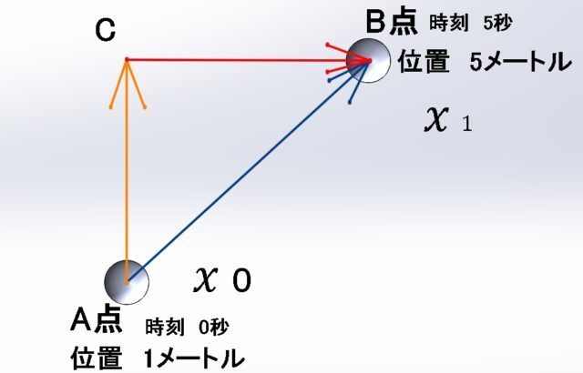 上記の式では時間は関係が無いことがわかります。変位はとにかく始点から終点まで移動した量です。