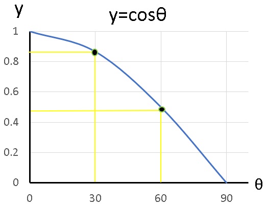 このサイトは設計者が解析できるような思考力を付けてもらうためのことが目的ですので、y=cosθのグラフはみなさんが実際にかいてみてください。あまり長いグラフや点の数が多いとは大変ですからθの値が90度までで4点くらいのものにします。